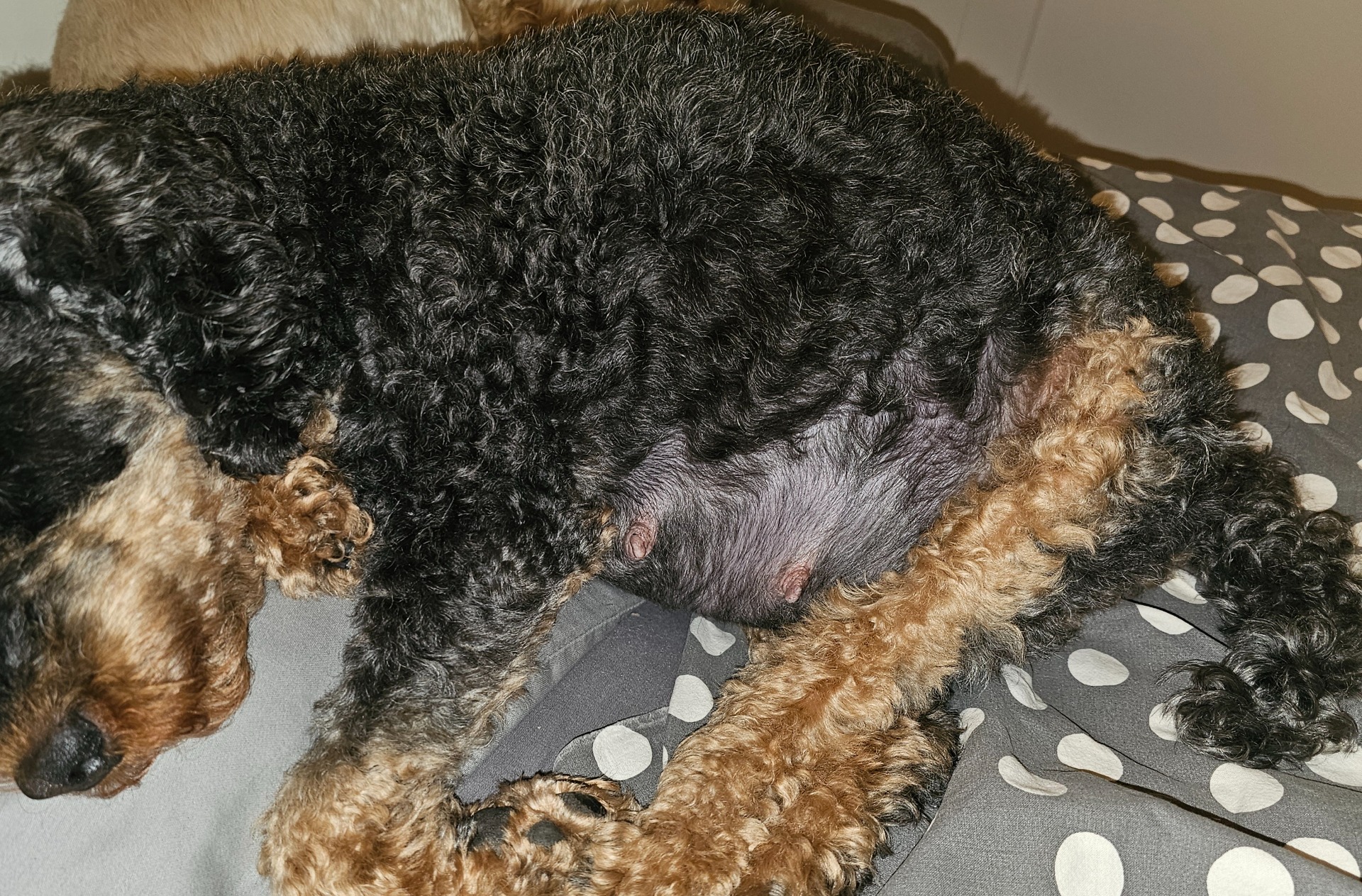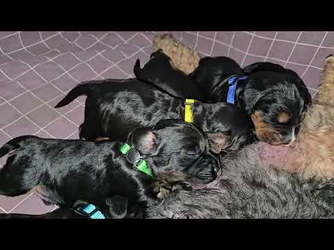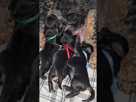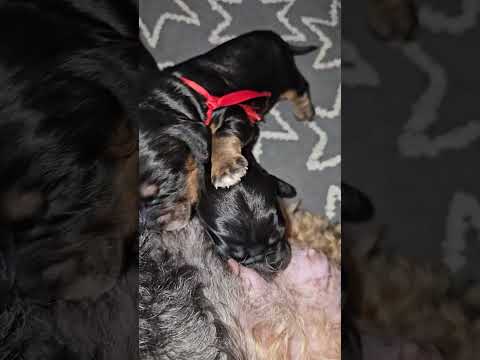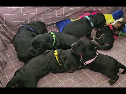 Alla valparna har öppnat ögonen helt nu och dom börjar försöka ta sig runt mer. Vi har även en liten herre (blå) som redan tänker varför nöja sig med valplådan när världen är så stor utanför 😝😅